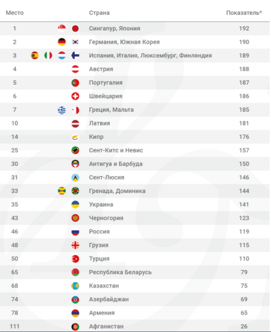 Паспорта Сингапура и Японии делят первое место в Индексе (192 безвизовых направления), Германия и Южная Корея делят второе место с безвизовым доступом в 190 стран.