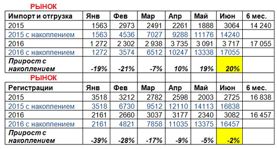 «Существенный рост рынка по импорту и отгрузке в апреле и мае 2016 года к апрелю и маю 2015 года компенсировал отставание предыдущих месяцев, - говорится в релизе. - Регистрации в марте и апреле 2016 года превысили регистрации в марте и апреле прошлого года, рост импорта и отгрузки в апреле и мае 2016 года по отношению к аналогичному периоду прошлого года увеличили регистрации в июне 2016 года по отношению к июню прошлого года. Снижение отгрузки в мае текущего года по отношению к предыдущему месяцу вызвано сезонными факторами».