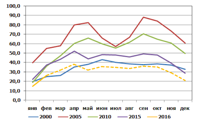 В случае сохранения отрицательных тенденций в отечественной металлургии, с учетом дальнейшего переключения перевозок грузов на альтернативный транспорт (автомобильный и водный), в 2016 году в сравнении с предыдущим годом прогнозируется уменьшение отгрузки металлолома по железной дороге на 21,7% (-3,1 млн т) до 11,3 млн тонн. На рисунках ниже представлены ретроспективные данные об отгрузках черных металлов по сети ОАО «РЖД» и помесячный прогноз среднесуточной отгрузки лома черных металлов (пунктирная линия).